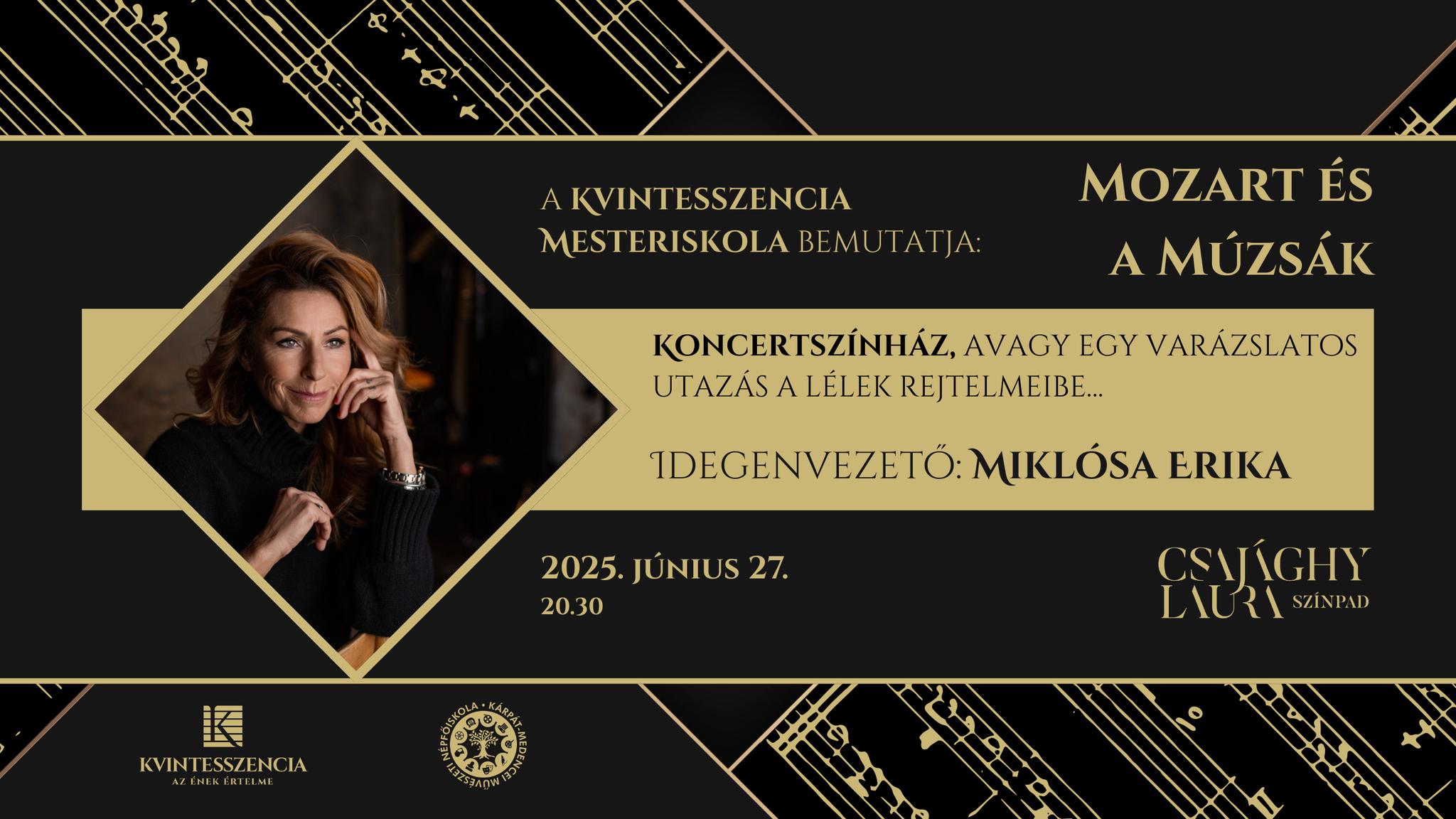 Miklósa Erika mesteriskolája a Kvintesszencia vizsgaelőadásában Mozart nagyoperáinak szereplői kelnek életre megható történetet szőve a férfi és a nő kapcsolatának nagy állomásairól. A képzés frissen diplomázott hallgatói számos legendás szereppel mutatkoznak be egy varázslatos utazáson át az emberi lélek rejtelmeibe. Társasutazásra invitáljuk hát Önöket ezen a különlegese estén, ahol az idegenvezető Miklósa Erika.